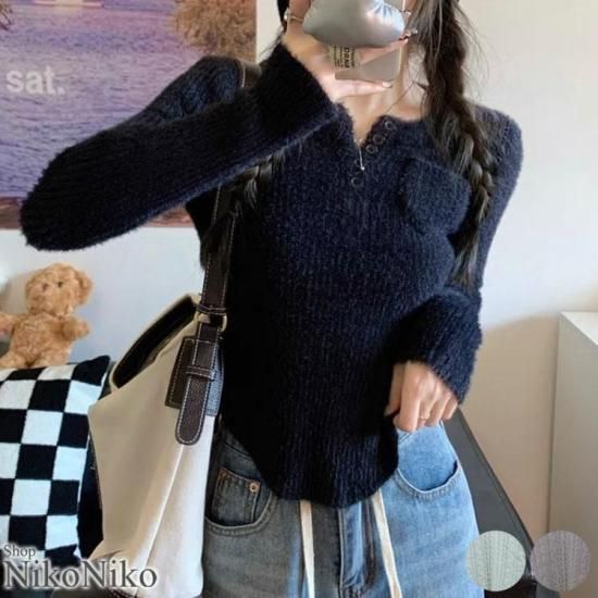 全品送料無料一部除く ヘンリーネック ポケット付き シャギーニット【即納】 レディ
