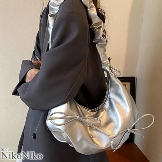 ダブルリボン シャーリング メタリックシルバーバッグ