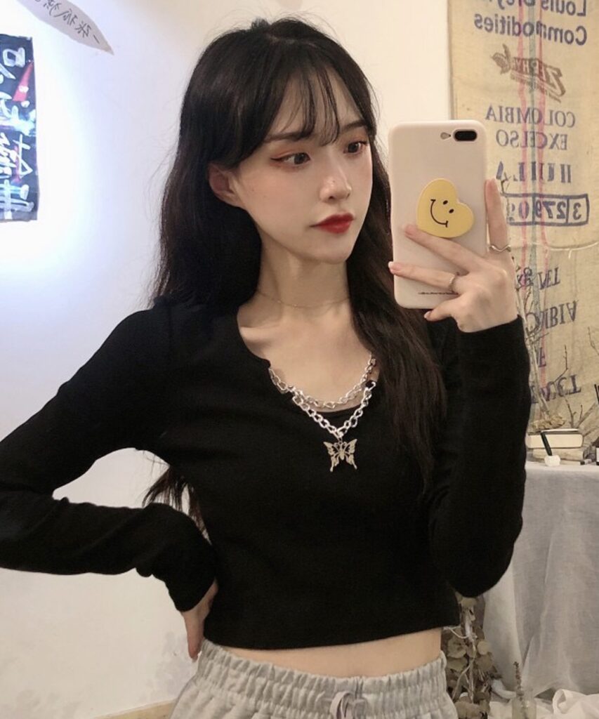 胸元のカットアウトがポイントになった、韓国っぽさ満点のチビT